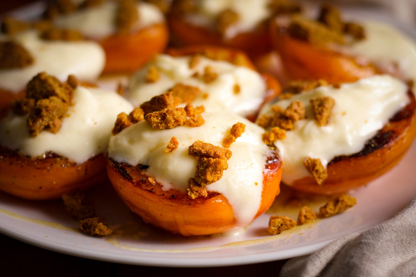Note: You can also “grill” the apricots in a hot skillet. Simply add the oil to the skillet instead of brushing it on the apricots and set the skillet over medium-high heat. Add the apricots, cut side down, to the hot skillet and let them cook until they’ve formed a dark brown crust.