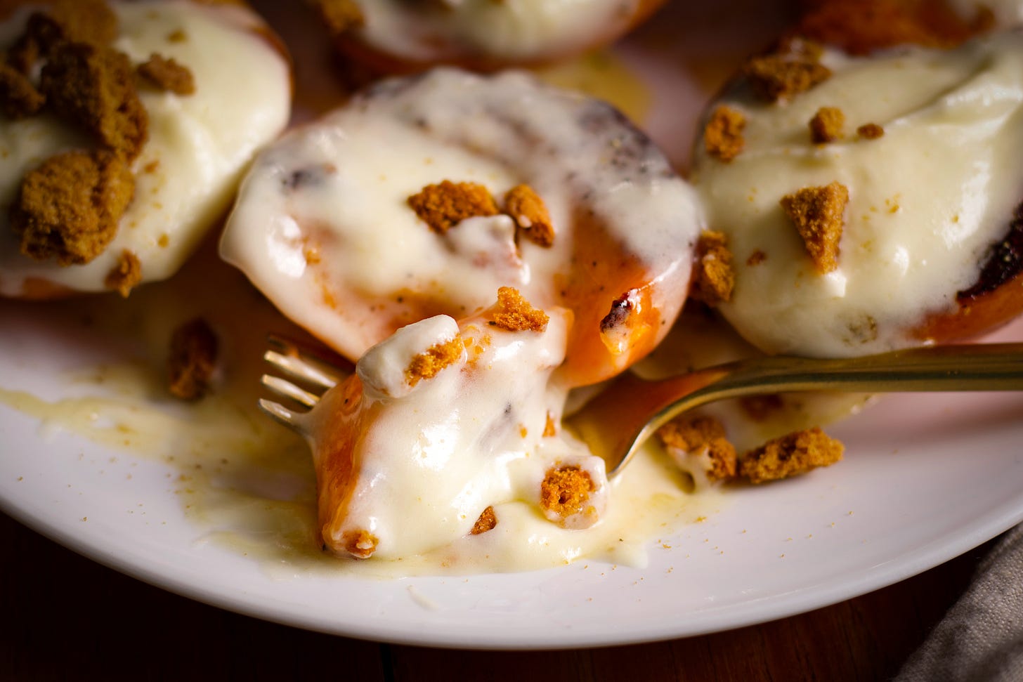 Allow the apricots to cool to almost room temperature. Drizzle them with a honey then fill their centers with a generous spoonful of lemon mascarpone cream. Sprinkle with crushed cookies and dig in.