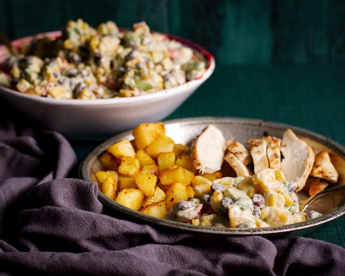 The Court Jester Cocktail + Roasted Corn Salad with Jalapeño Cashew Cream + Country Potatoes + Rosemary Grilled Chicken + Cherry Chocolate Chunk Cookies