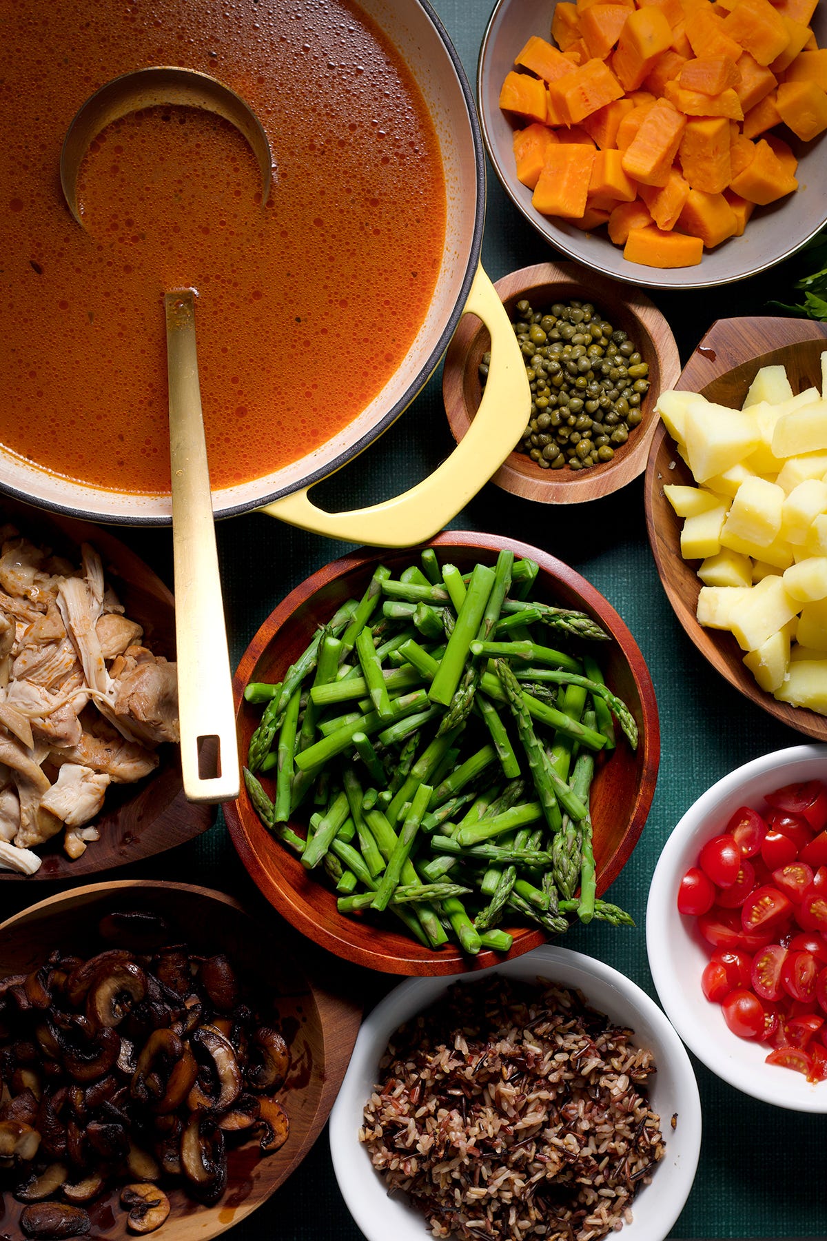 Here’s the basic idea: Prepare a really flavorful, super delicious and complex broth. Then, prepare as many different ingredients as you like for people to build their own bowls of soup. Set all the options out in separate containers and let your guests go to town.