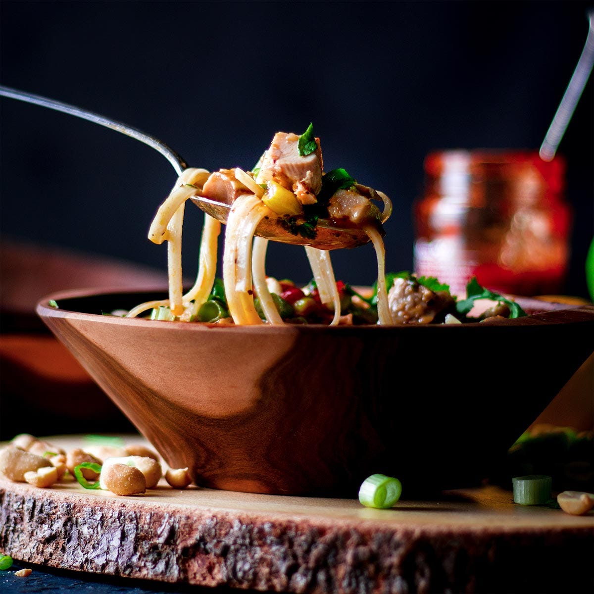 Toppings: thin sliced red chilies, scallions, chopped fresh cilantro, peanuts, chili garlic sauce, fresh lime slices