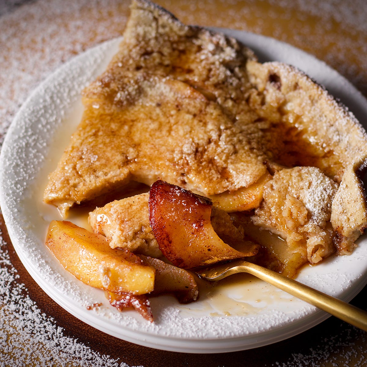 In this recipe, I added thinly sliced apples cooked in butter, sugar, cinnamon, and nutmeg. The result is a creamy, custard-like pancake with the warm flavors of apples and cinnamon. It’s easy to make and so very delicious.