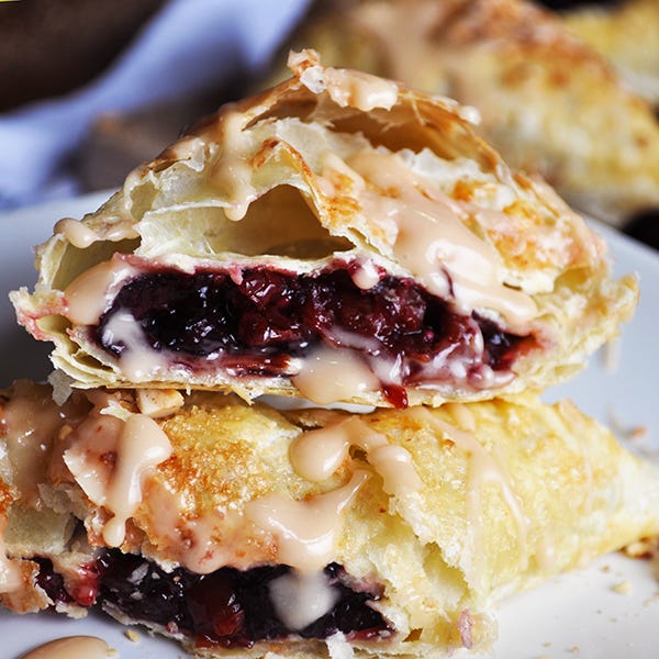 These delicious pastries are filled with easy homemade almond paste and apples cooked in butter, brown sugar, and cinnamon until soft and saucy. After baking until puffed and golden, a generous drizzle of brown sugar glaze makes a good thing even better. Frozen puff pastry is the secret to keeping the prep time to around 30 minutes.