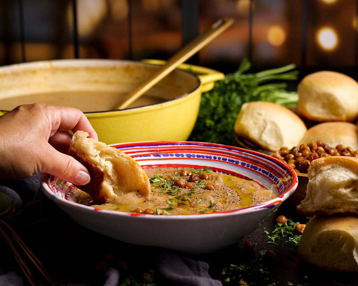 I’ve shared the recipe for these buttery homemade rolls before and it’s highly likely I’ll share it again. They’ve been a family favorite in my home for decades, and on the day I took the photos you see here for potato and white bean soup I thought that nothing sounded better to me than dipping warm rolls in my bowl of soup.