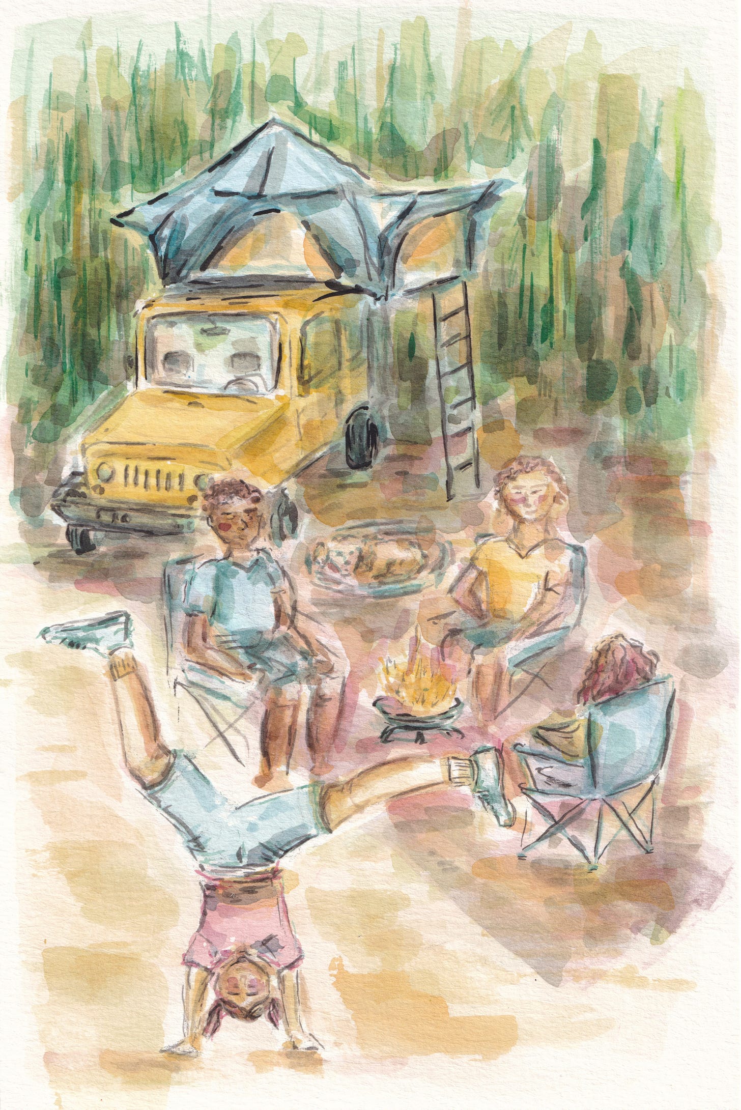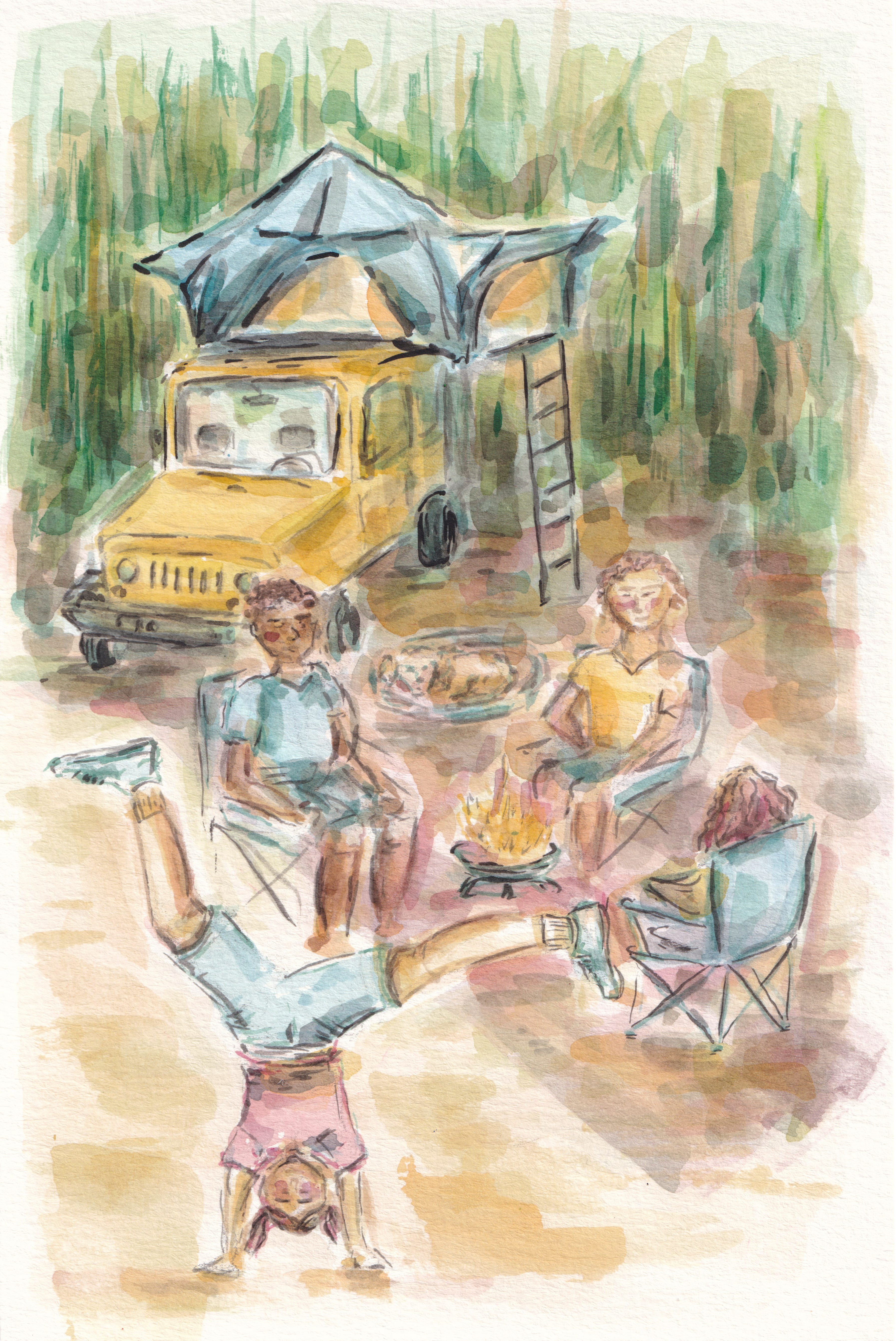 A young family pulls into the space next to him, a mom, a dad, a little girl. They wave. He waves back. The parents get to work setting up their tent while their little girl, maybe 6 or 7, entertains an invisible audience. Cartwheels, bows, spontaneous opera. A whole Broadway show performed before the parents can unpack.