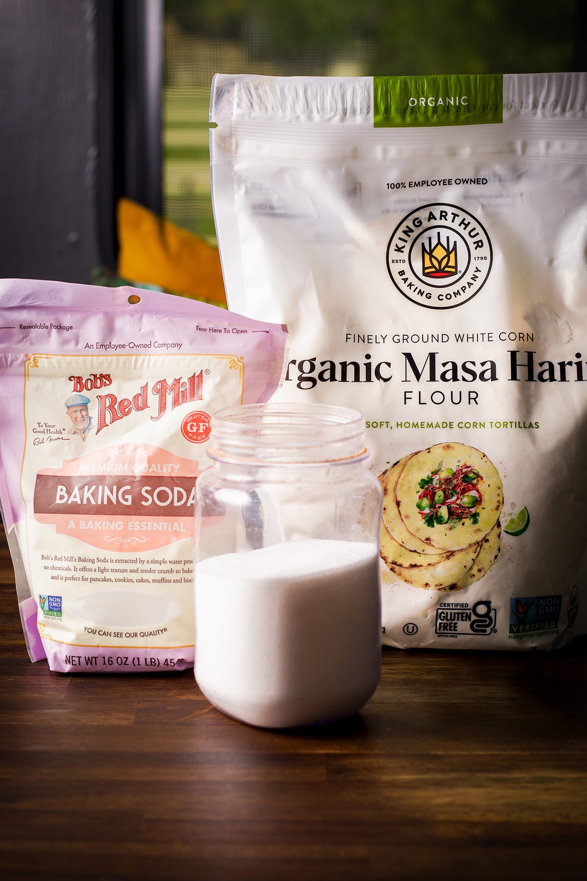 Add the masa harina, baking soda, and salt to a bowl and stir with a wire whisk to combine. Add the water and mix until a soft dough forms. If the dough is too dry to form a ball, add more water, a little bit at a time, until you can press the dough into a ball. Wrap it in plastic wrap and let it rest for 5 minutes.