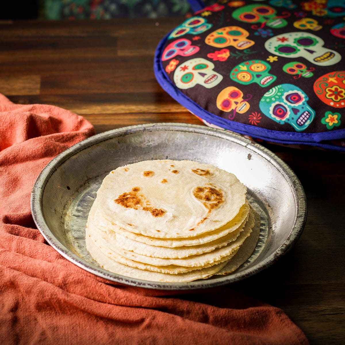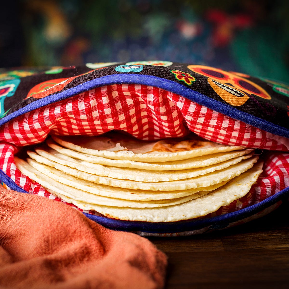 I like to place the tortillas in a tortilla warmer pouch as they come off the skillet which will keep them warm and soft for quite some time - an hour or longer.