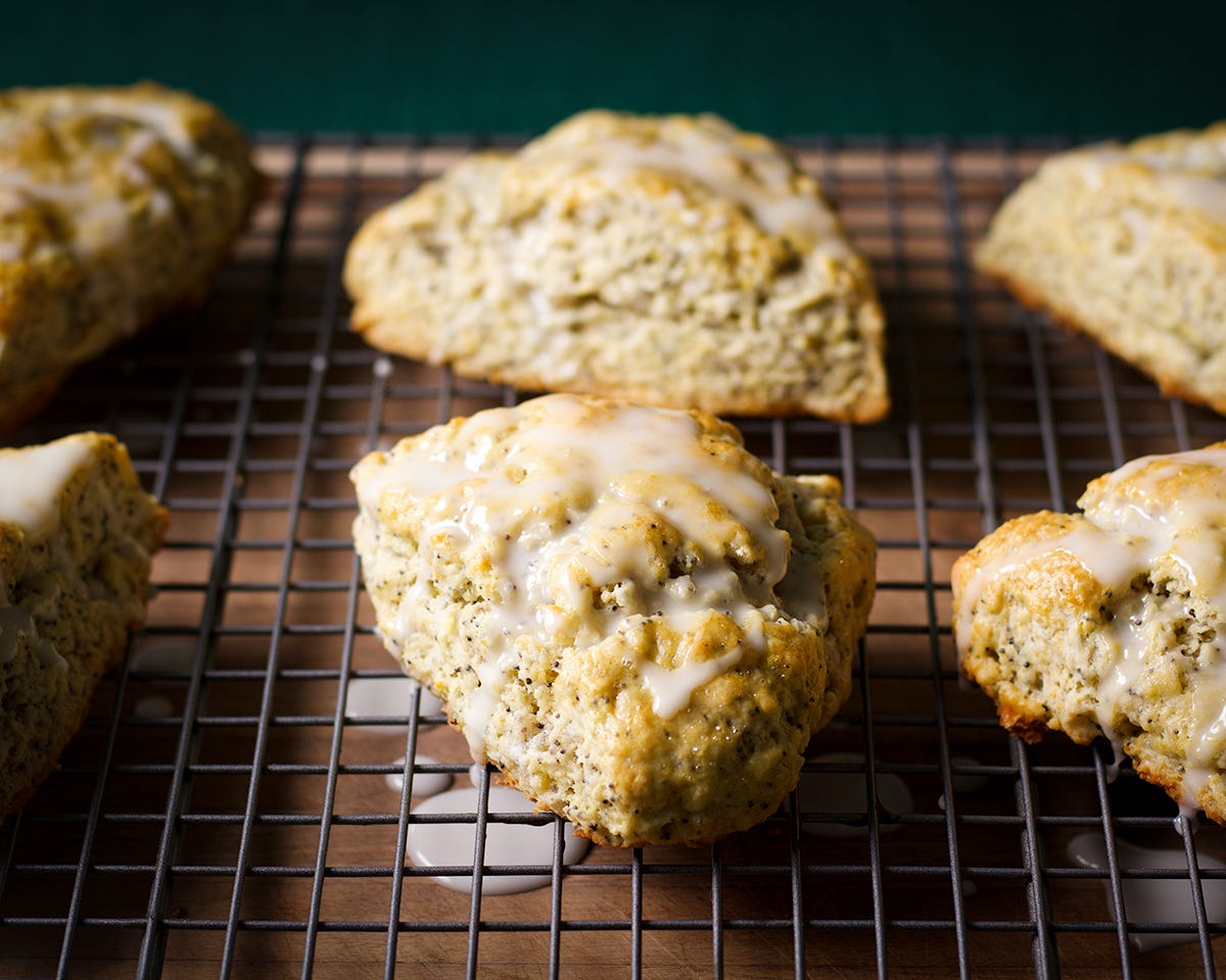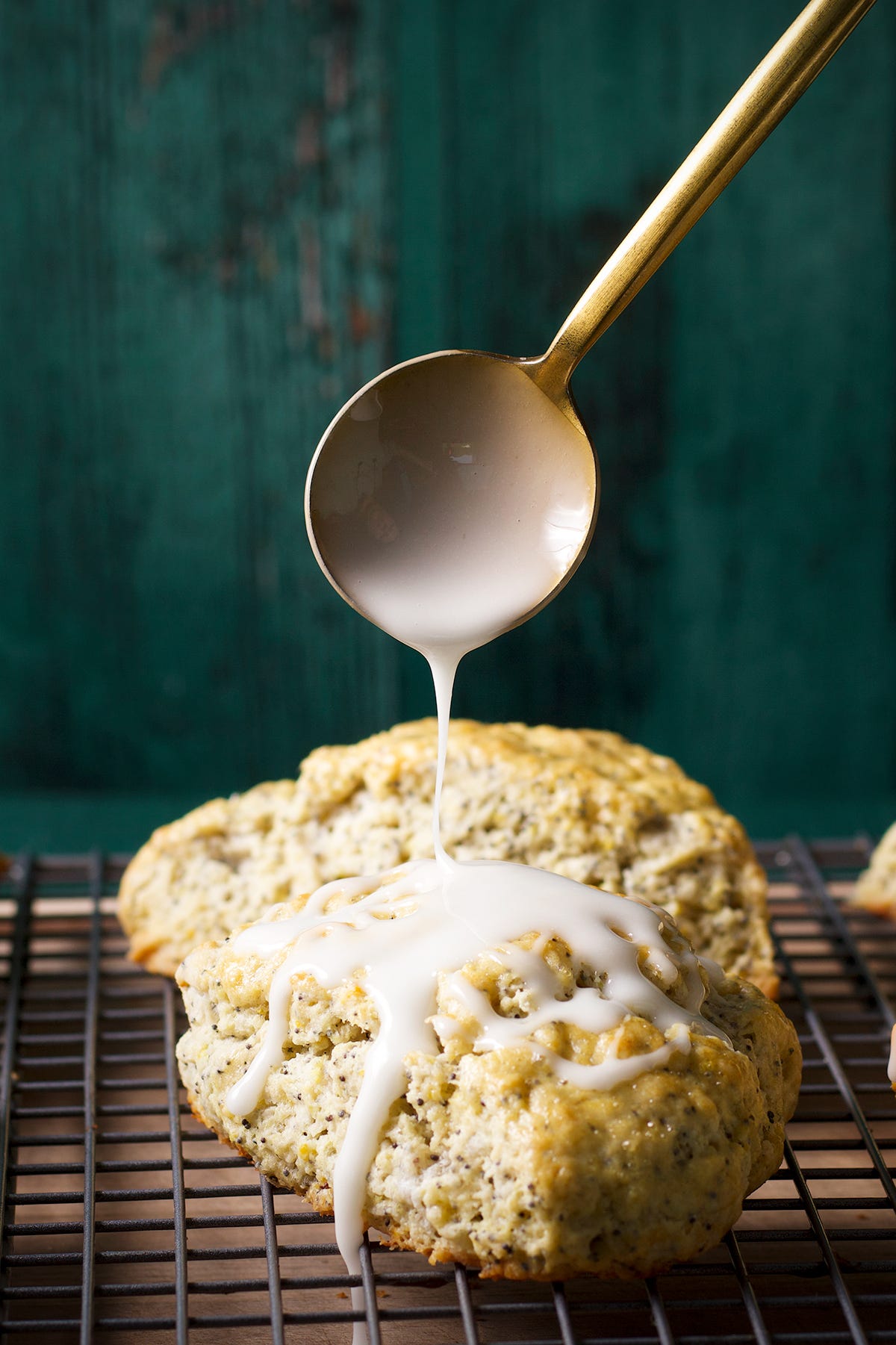 To make the icing: Whisk 1/2 cup powdered sugar and a pinch of salt into a tablespoon of lemon juice, whisking until all the sugar has dissolved into the juice. To thicken the icing, add a bit more powdered sugar. To thin, add a bit more lemon juice. Drizzle the scones with icing and serve.