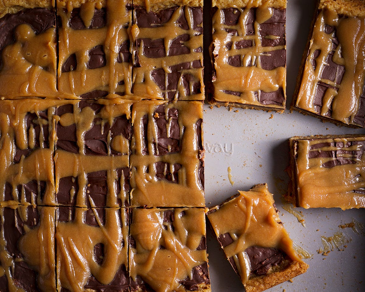 Use a spoon to drizzle the glaze over the bars in a crosshatch pattern, or in whatever pattern you like. (Optional: Top the glaze with a generous handful of chopped roasted and salted peanuts.)