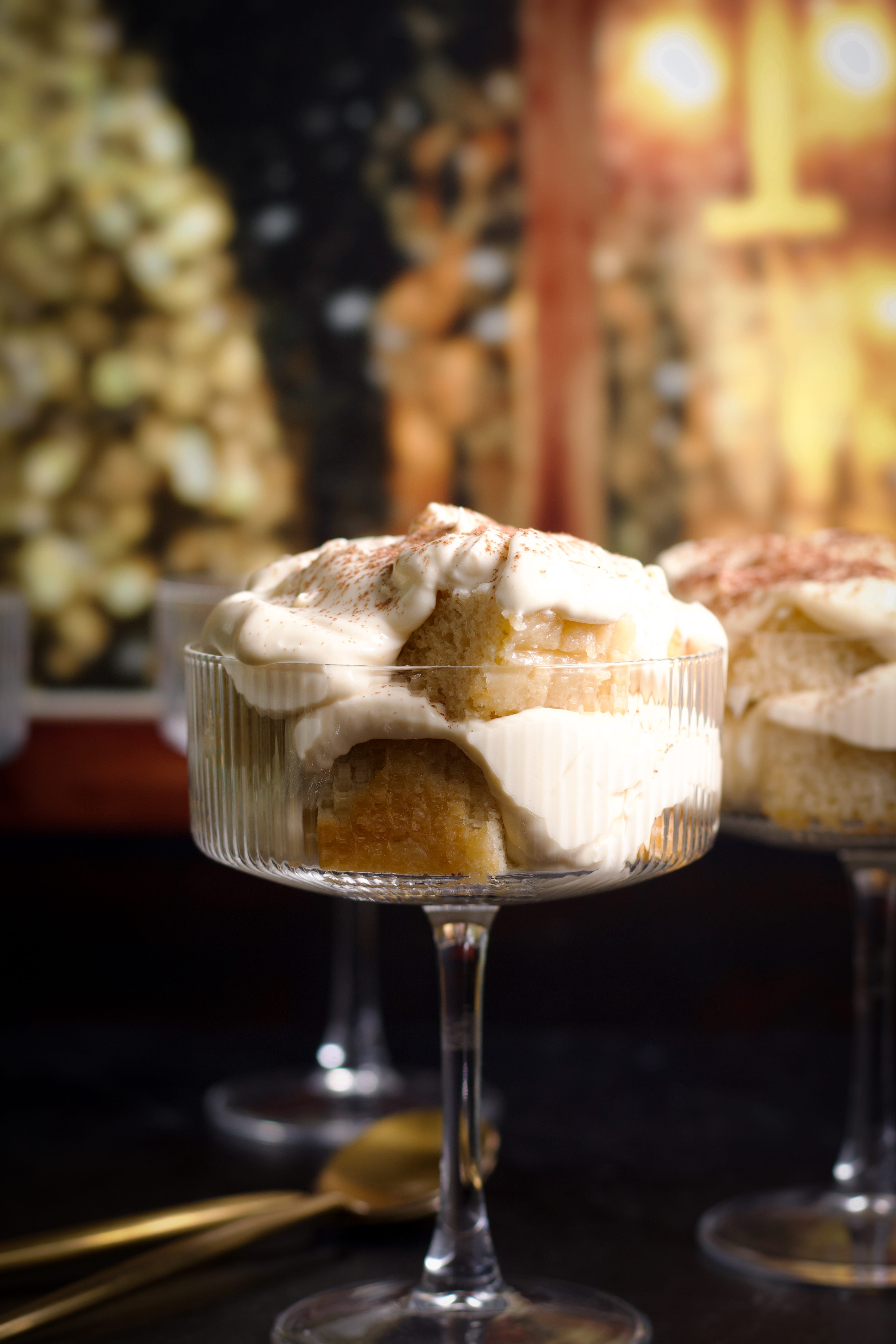 Add a few cubes of cake to a glass or a bowl and top with a generous layer of mascarpone cream. Repeat these layers, cake cubes and mascarpone cream. Dust the top with a bit of unsweetened cocoa powder. Refrigerate until ready to serve.