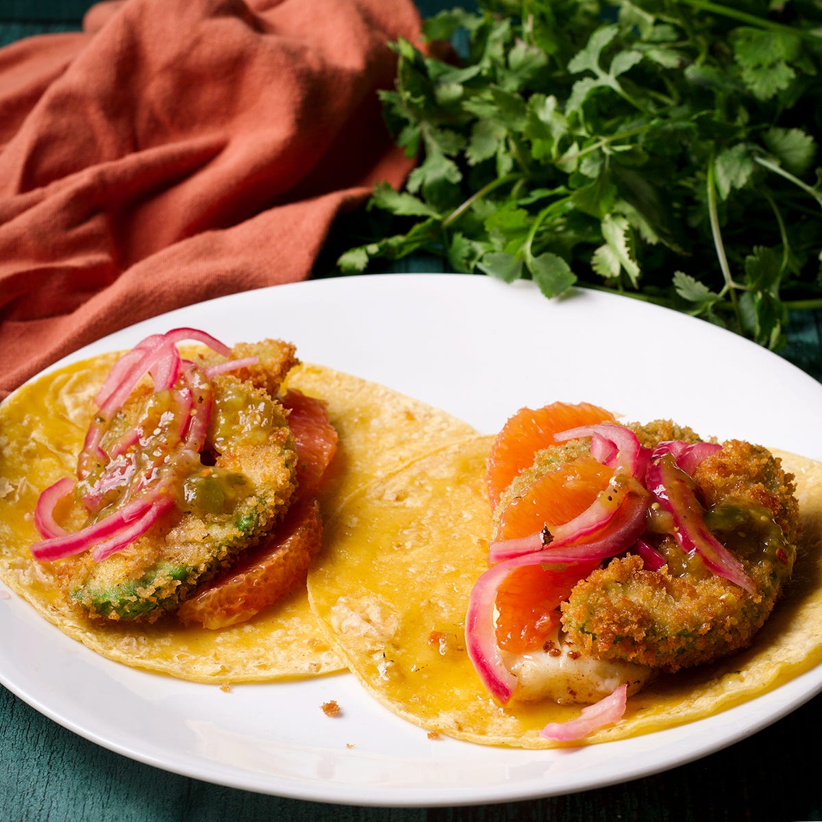 If you’re an avocado lover, you’re probably going to want to add these tasty little tacos to your plan for the week. This is the kind of recipe that you can easily scale to make as many tacos as you need, from two to twenty. And the combination of crispy panko and creamy avocado + cheese + all the bright fresh flavor from orange slices, quick pickled onions, and salsa verde is just plain dreamy.