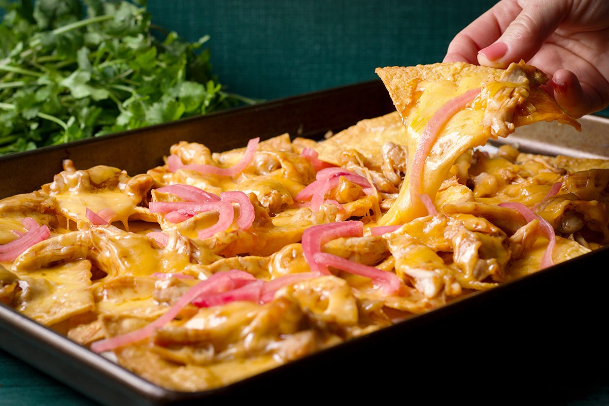 Remove the baking sheet from the oven, scatter some quick pickled onions over the top of the nachos, then just dig in.