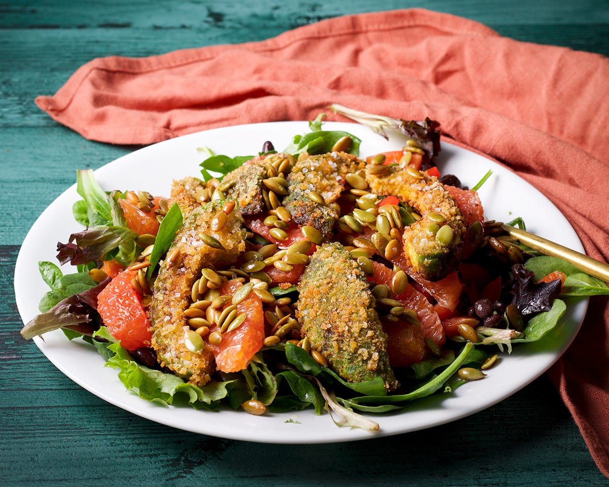 Add salad greens to a plate and drizzle the greens with vinaigrette. Lay a few slices of orange and a few crispy avocado slices over the greens then top with toasted, salted pumpkin seeds.