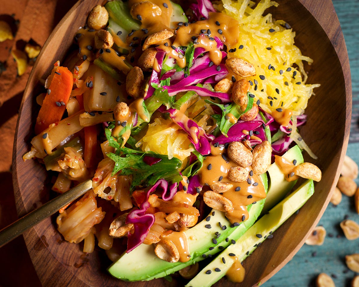 Pile the cucumber and cabbage salad on top of the spaghetti squash. Top with kimchi.