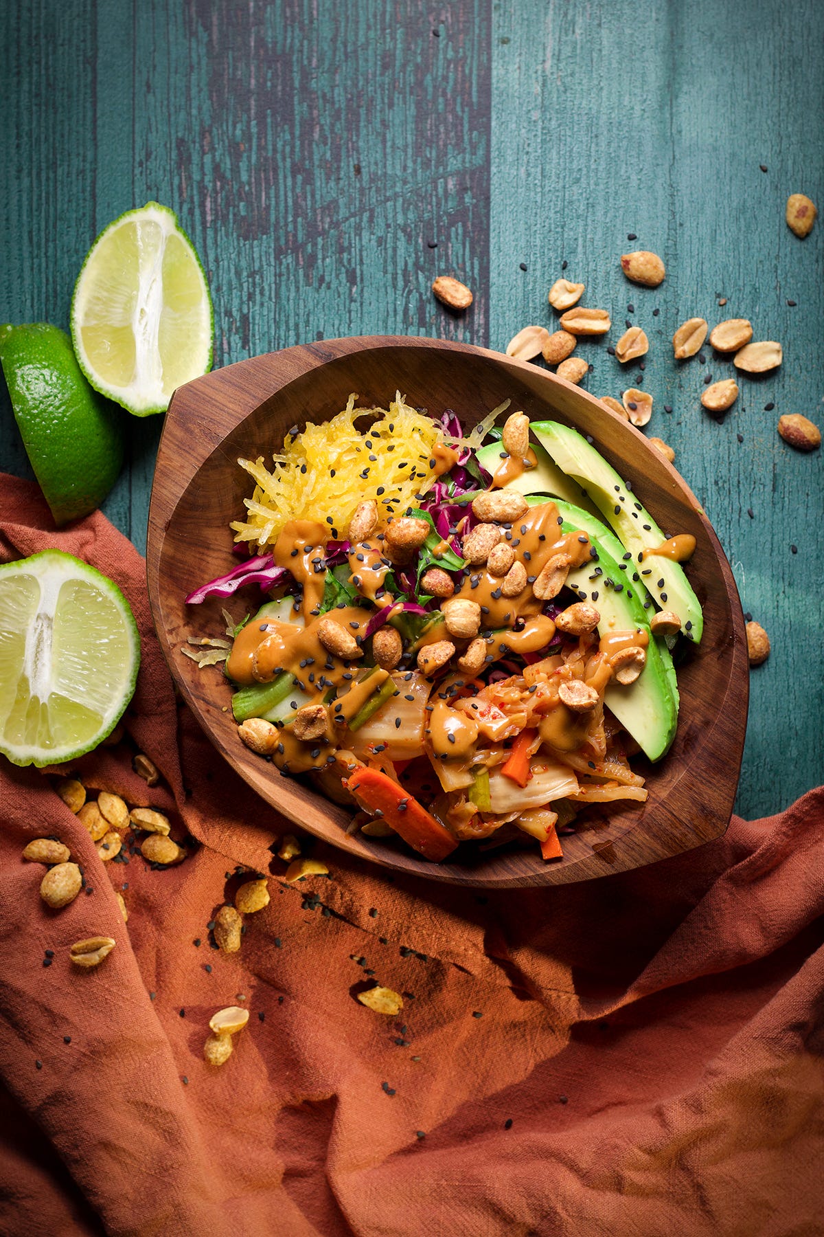 Drizzle peanut sauce over the bowls and top with a handful of roasted peanuts and a sprinkle of sesame seeds. Serve with lime wedges.