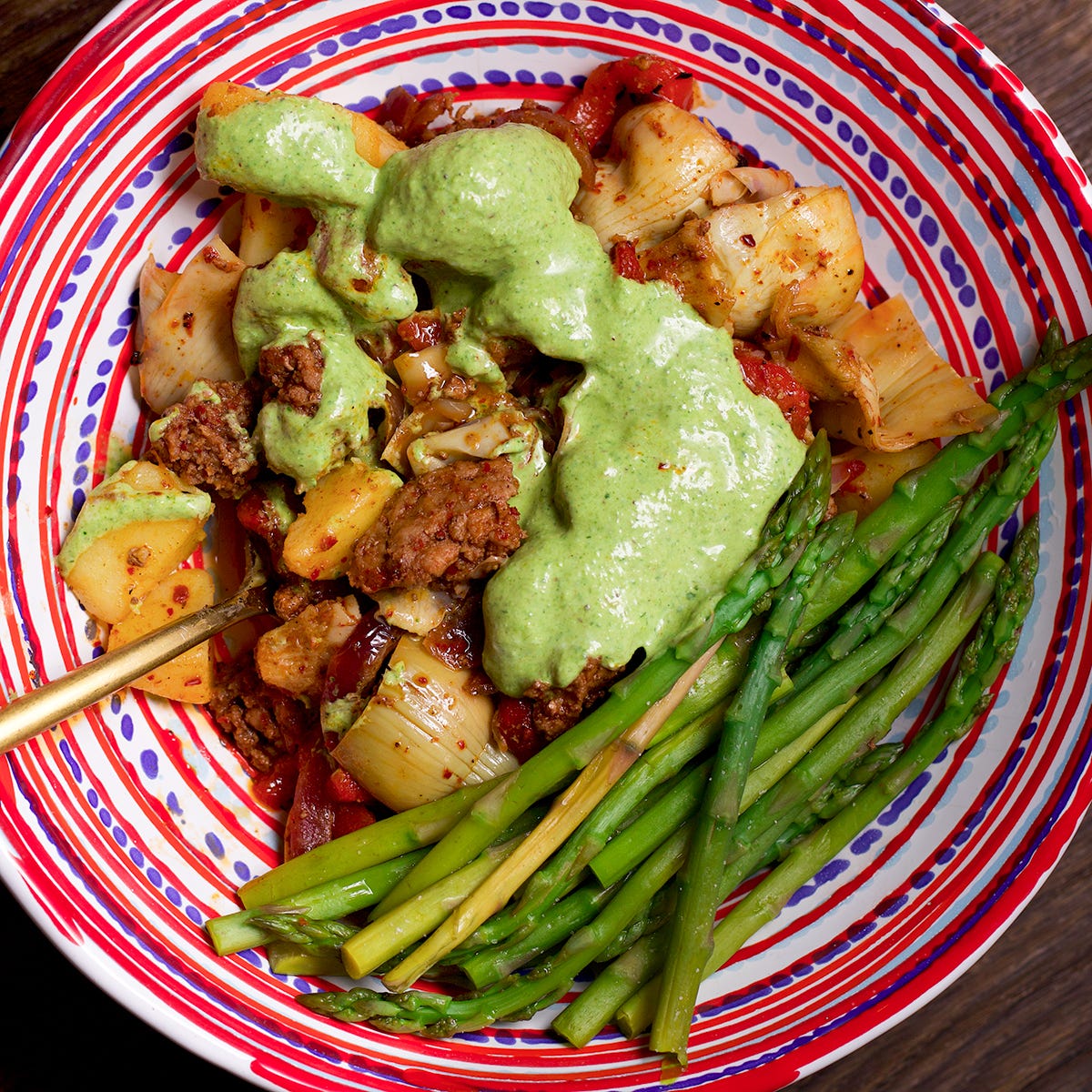 Spiced ground beef and veggie bowls with herby yogurt sauce