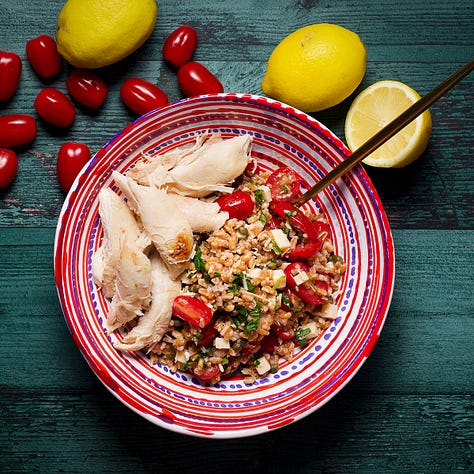 Farro and Tomato Salad: This is one of those salads that you can make a big bowl of and keep it in the refrigerator to snack on whenever you like. In the summer, it’s a great way to show off garden fresh tomatoes. In the winter, I opt for cherry tomatoes which tend to be good all year long. To add some extra protein, serve it with hard or soft boiled eggs, tuna or any kind of cooked seafood, rotisserie or roast chicken.