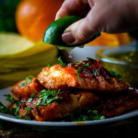 Adobo Fish Tacos: These vibrant, flavorful fish tacos include flaky white fish cooked in a delicious red-chili-based Mexican adobo sauce and topped with citrus fruit, salsa verde, and crispy fried onions. Every bite is a riot of flavors in the best possible way.