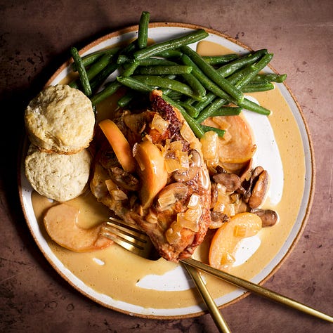 Chicken with Apples and Mushrooms in Cider Cream Sauce: Tender pieces of chicken swimming in a sweet and savory apple cider cream sauce with caramelized mushrooms and golden, buttery apples. To me, this dish is as warm and cozy as my favorite sweater and comes with the bonus of blanketing your home with the warm, rich smells of apples and cream.