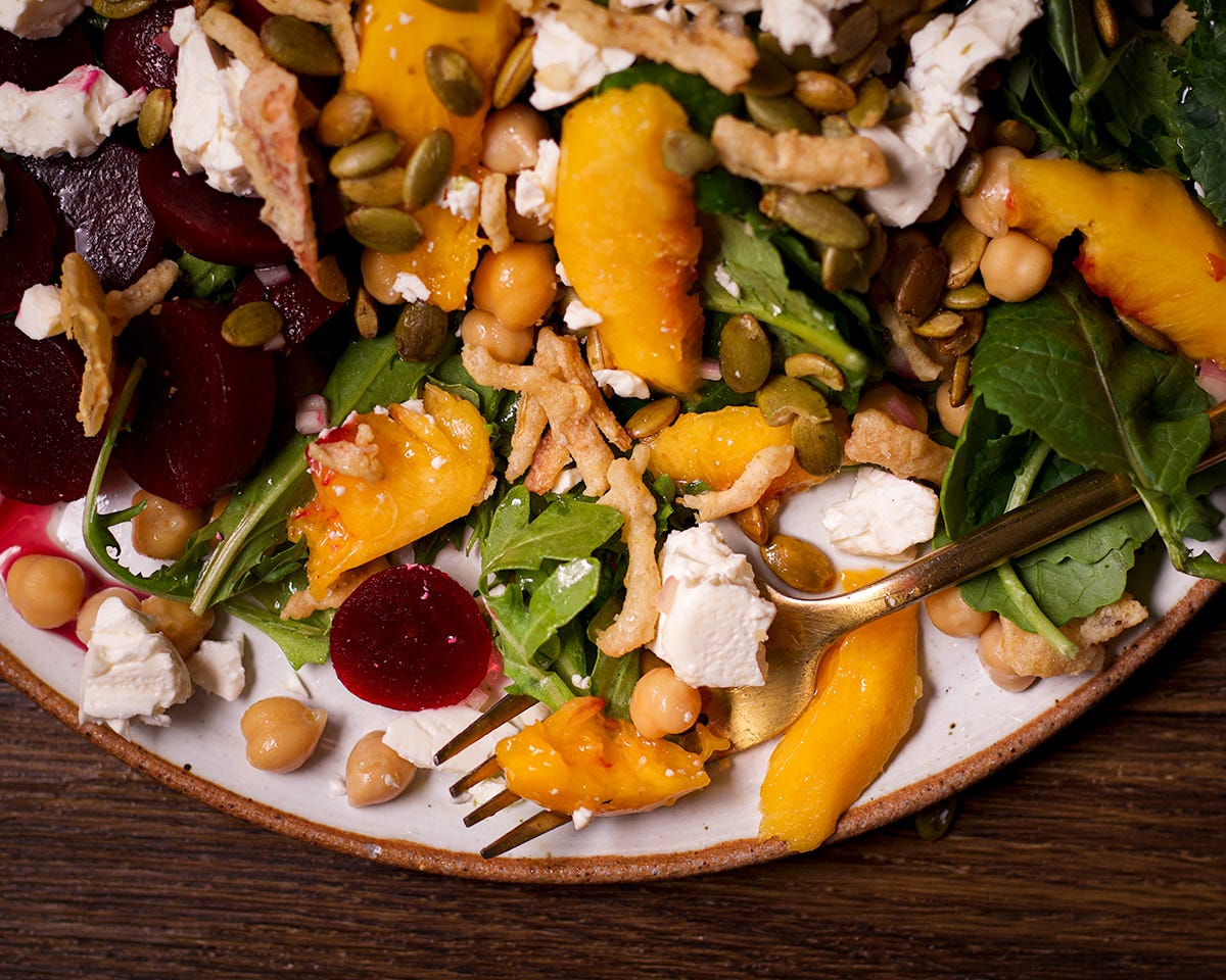 Sprinkle the crumbled feta over the salads, followed by the crispy fried onions and pumpkin seeds.