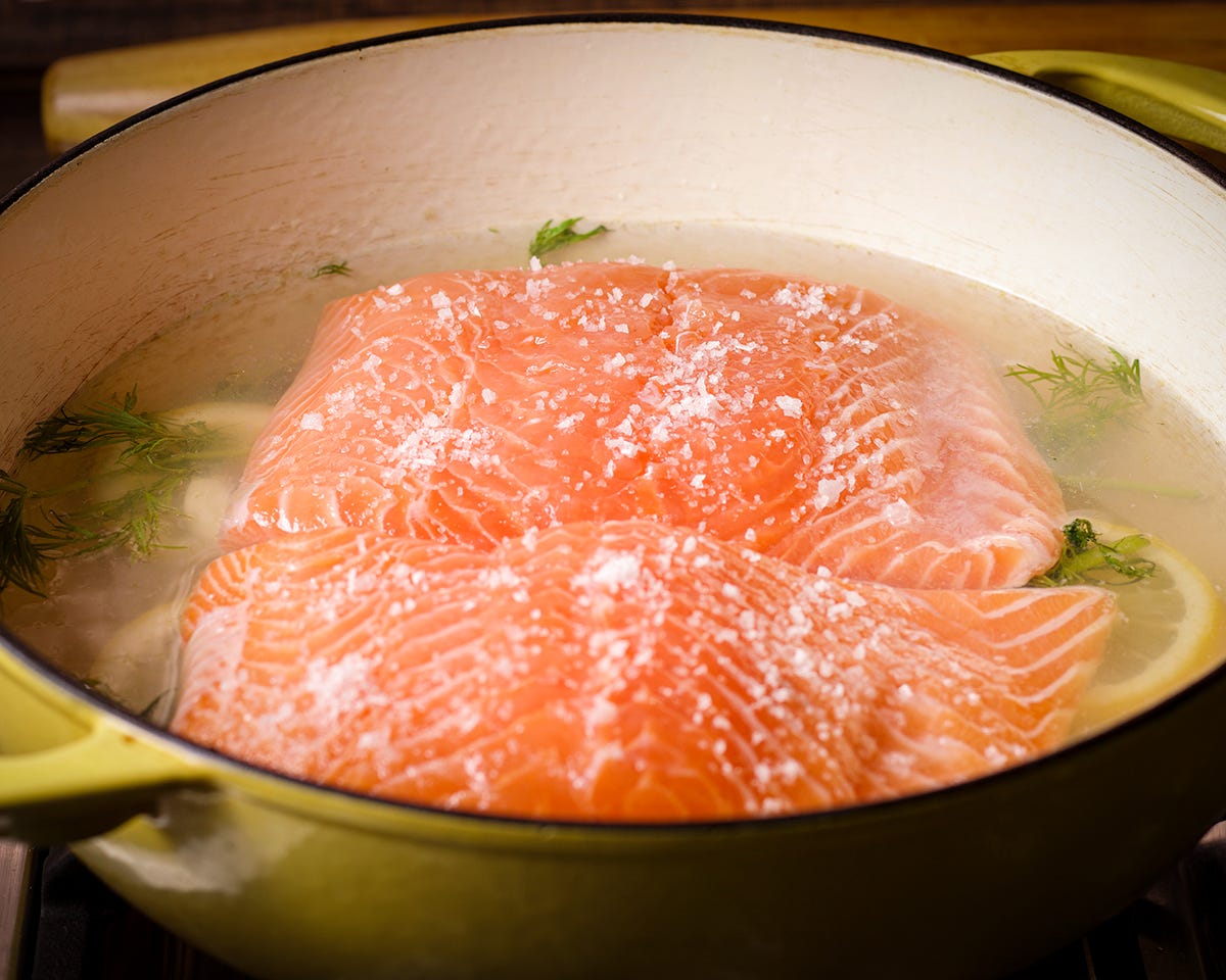 Set the pan over medium high heat and bring the liquid to a boil. Cover the pan with a lid, reduce heat to low, and maintain a very gentle simmer until the thickest part of the salmon registers 125 degrees - 11 to 14 minutes.