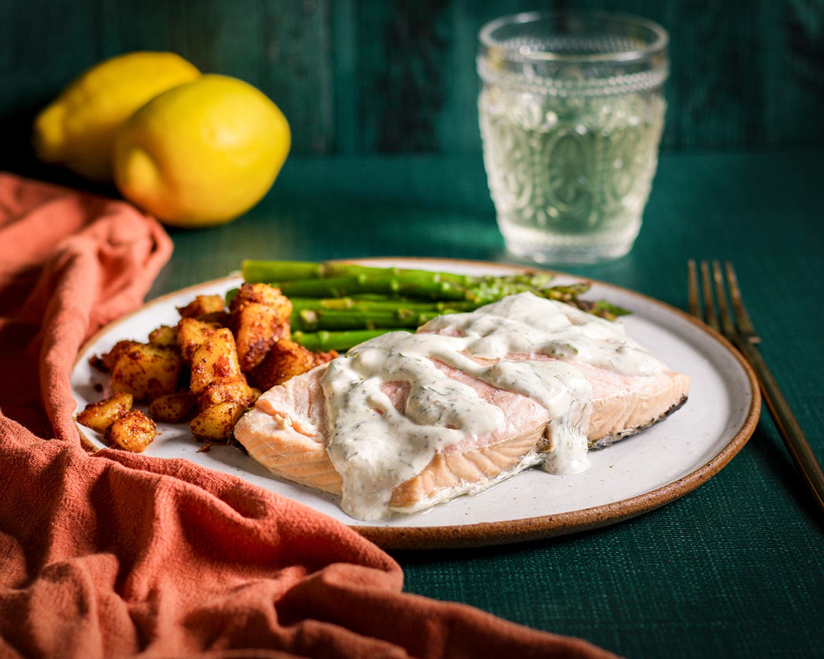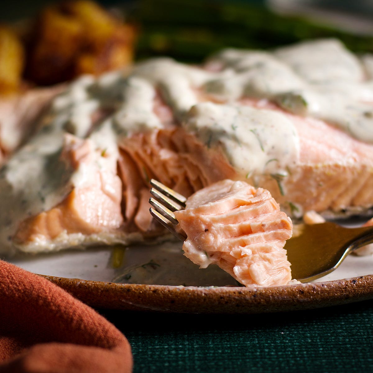Remove the skillet from the heat and gently lift the salmon out of the pan onto serving plates. Serve with the dill sauce.