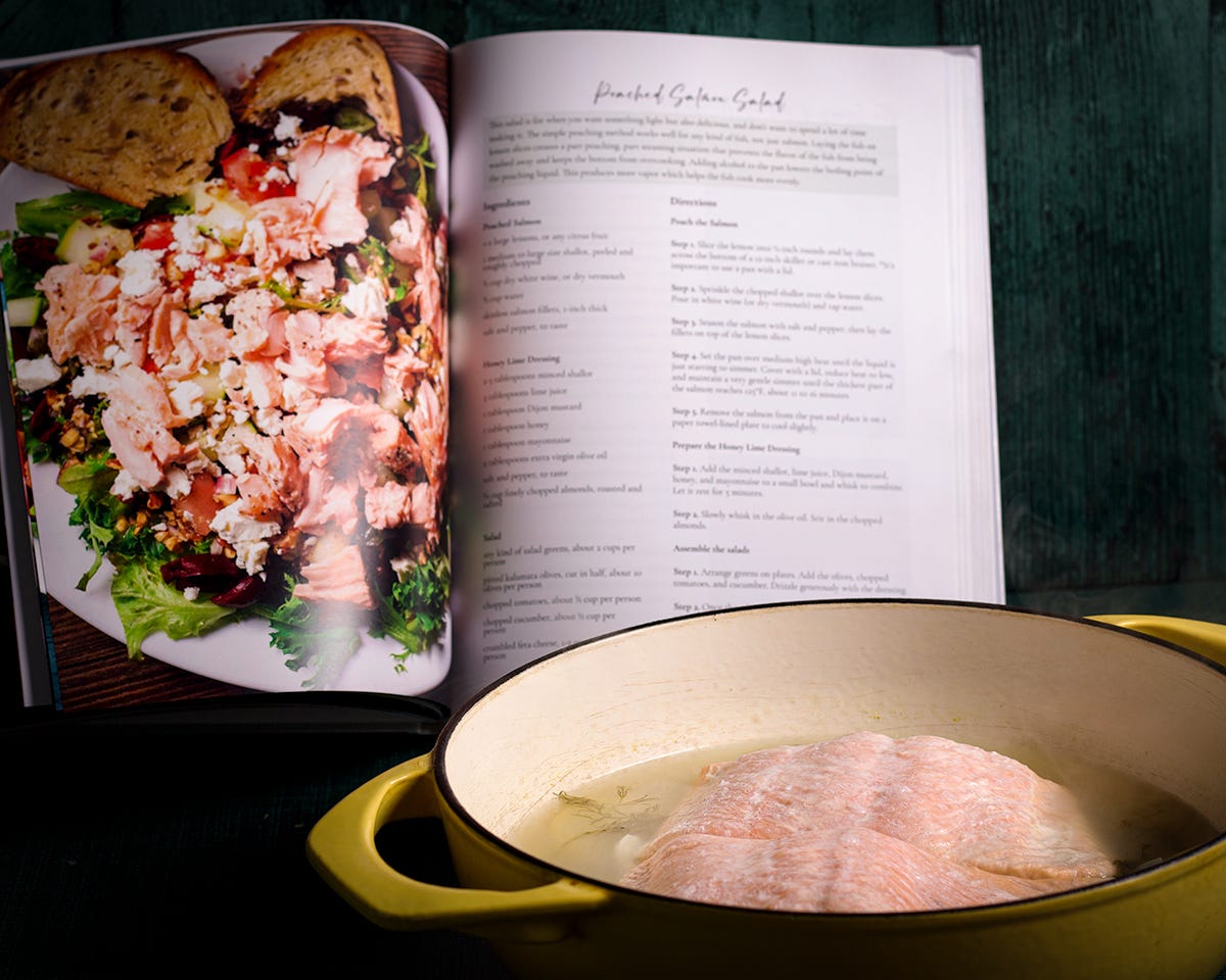 I love this technique for poaching salmon. I first shared it last year in this recipe for Poached Salmon Salad with Honey Lime Dressing, a recipe that also made it to the Let’s Get Lost Cookbook.