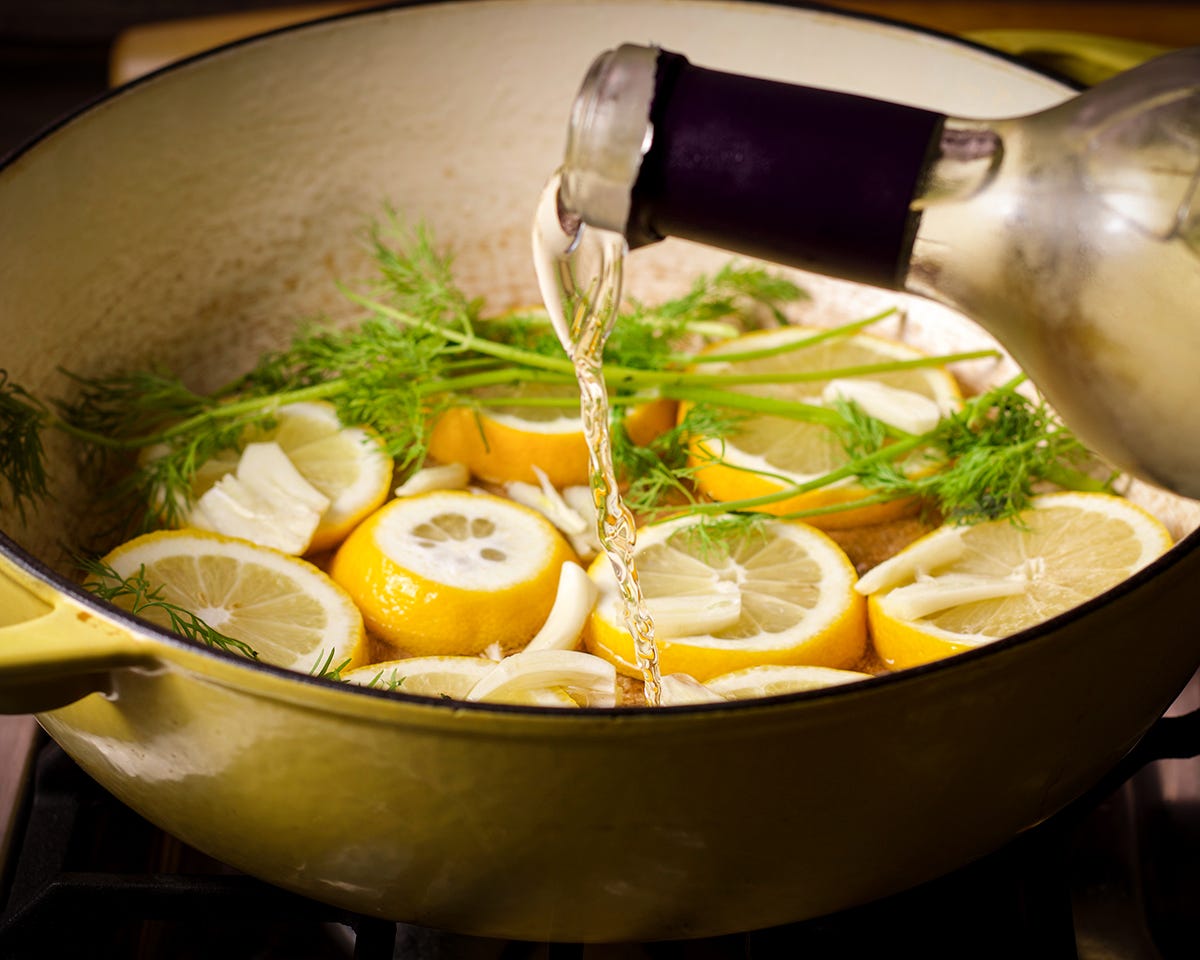 Peel and slice the garlic, and sprinkle the pieces over the lemon slices. Toss in a few sprigs of dill. Pour in about a cup of dry white wine (or dry vermouth).
