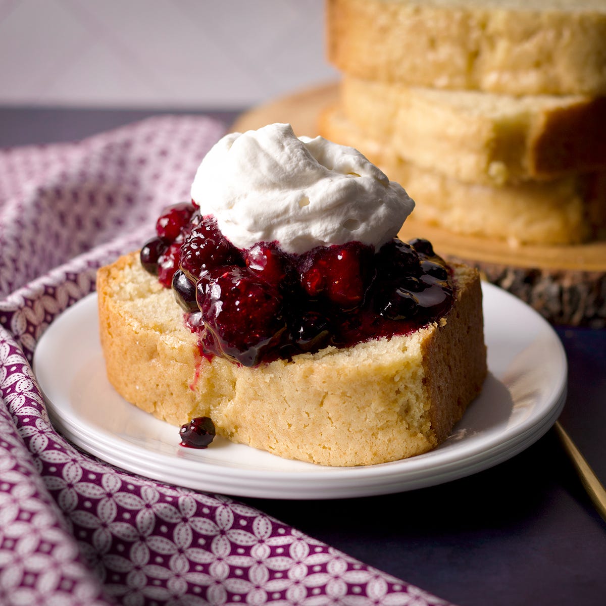 This simple vanilla loaf cake is one of my most used recipes. It’s delicious on it’s own but is also a kind of blank canvas for dressing it up with anything you like. Try it with whipped cream and berry sauce (pictured below), a drizzle of hot fudge or salted caramel sauce, or lemon mascarpone cream, of course.