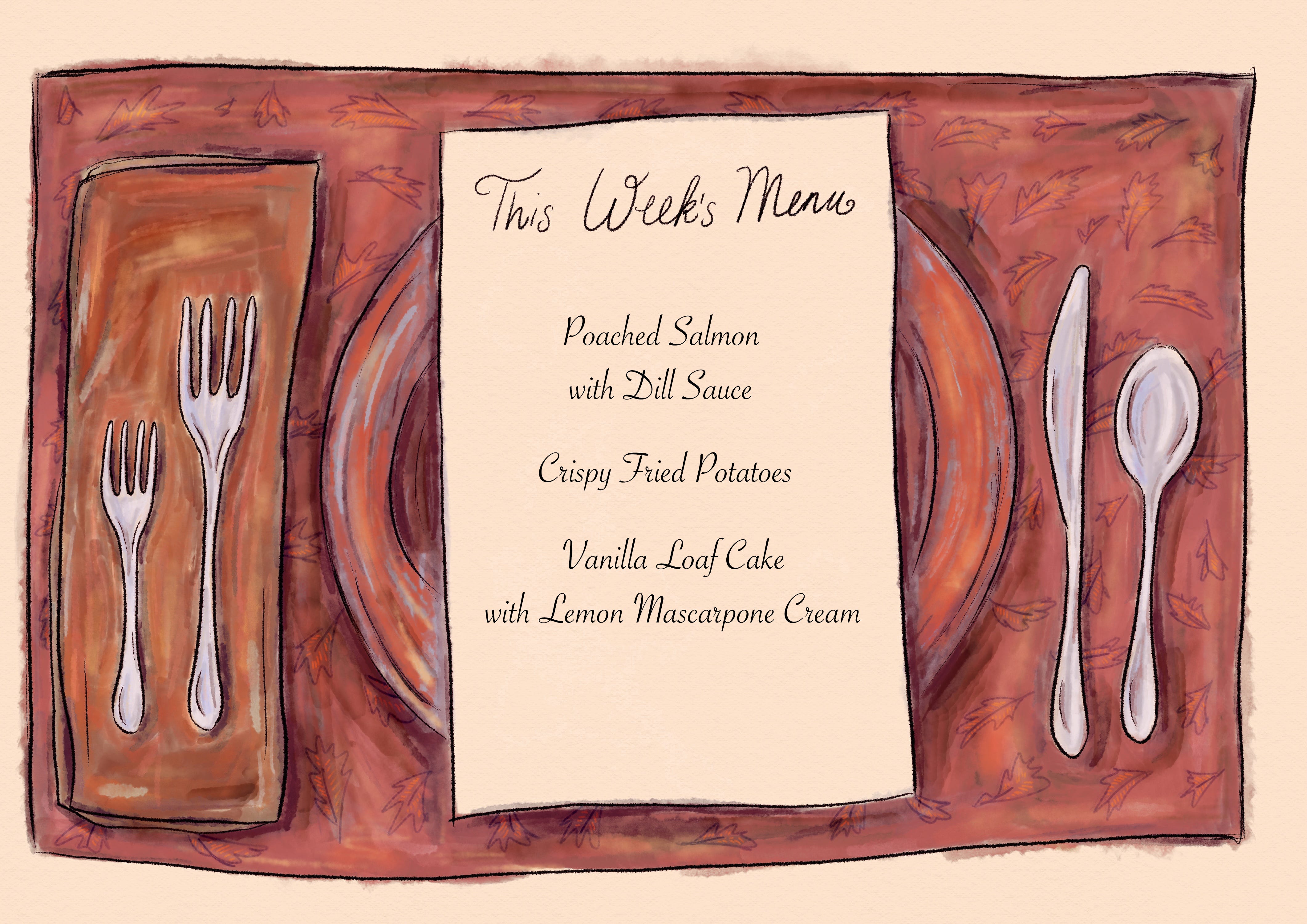 Poached Salmon with Dill Sauce + Crispy Fried Potatoes + Vanilla Cake with Lemon Mascarpone Cream