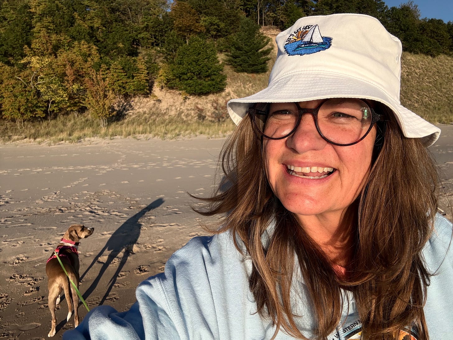 My good friend looking absolutely adorable in her new Let’s Get Lost bucket hat walking her equally adorable dog on the beach. ❤️