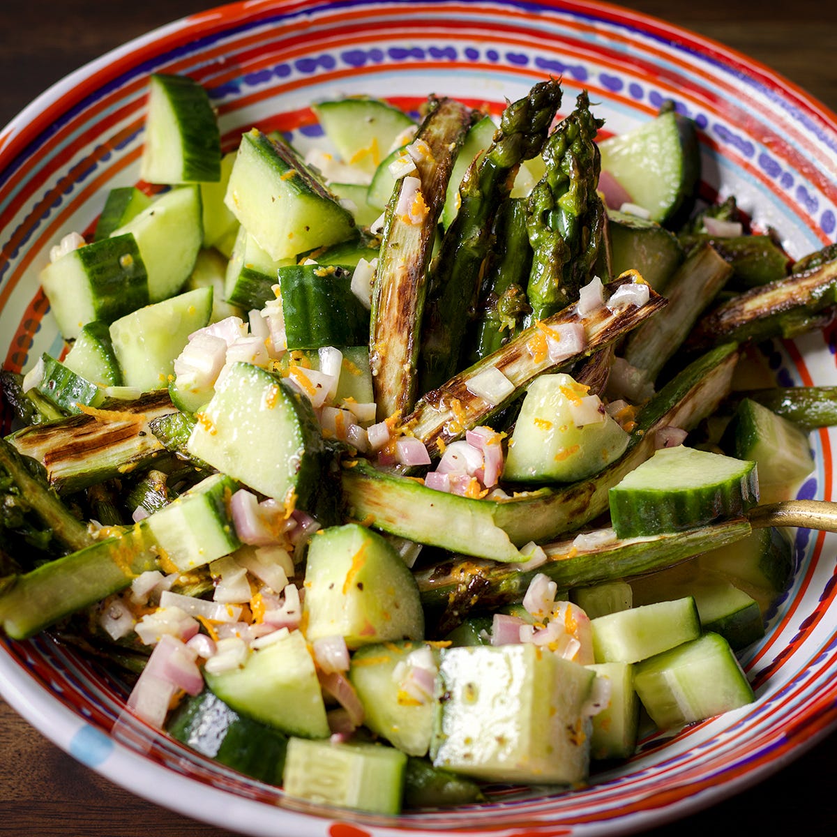 Add the asparagus and cucumbers to a bowl and pour the vinaigrette over the vegetables. Toss the vegetables around in the dressing to coat. Use tongs to remove the vegetables to a plate or serving bowl. Reserve the vinaigrette in the bottom of the bowl.