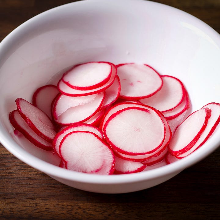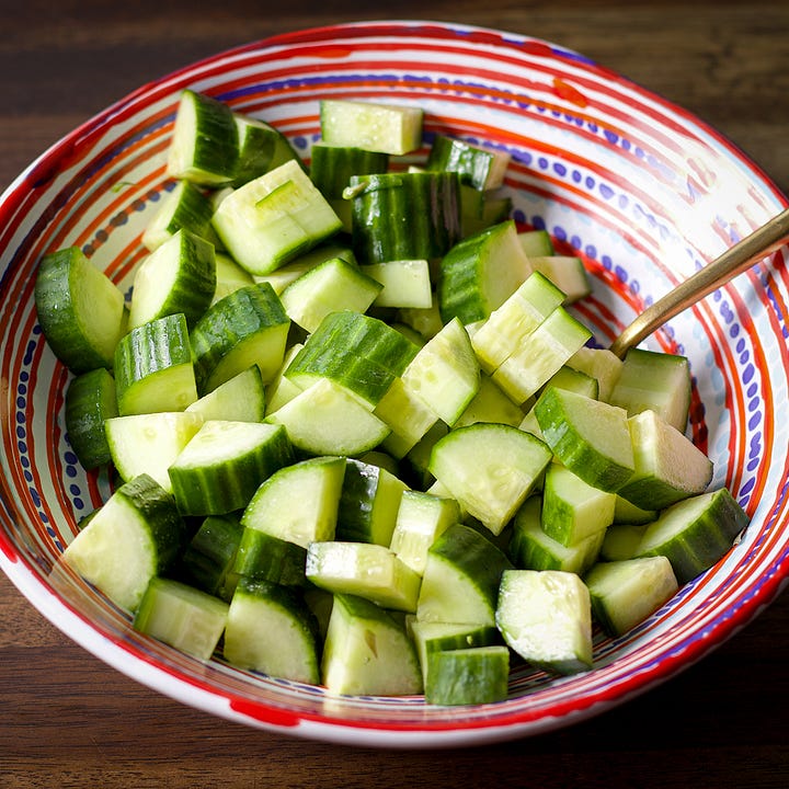 Cut the cucumber into bite-size pieces. Sprinkle with a bit of salt, toss to coat, and set aside. Slice the radishes into very thin slices, sprinkle with salt, toss to coat, and set aside. Cut the cherry tomatoes in half.