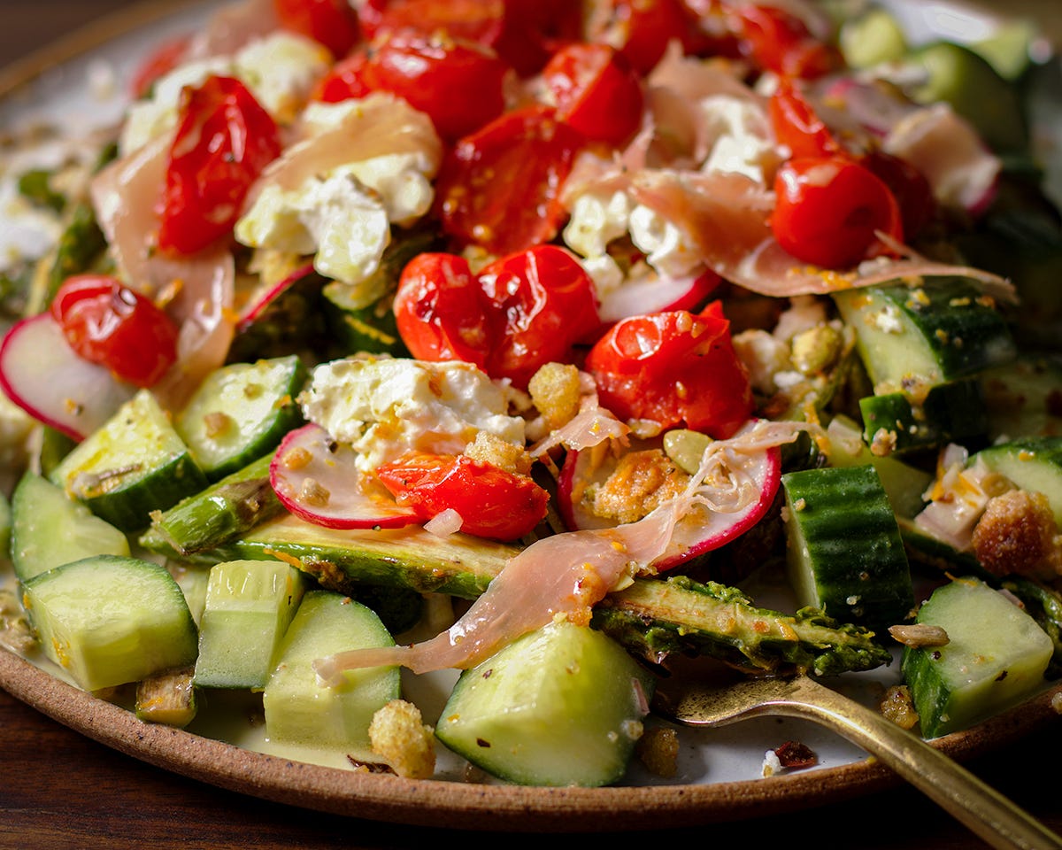 Top the asparagus and cucumbers with the sliced radishes. Sprinkle with something crunchy (I used pangrattato). Top with some feta cheese crumbles. Tear a few slices of prosciutto into thin strips and add them to the top of the salad. Top with the seared tomatoes. Drizzle with more of the vinaigrette and serve immediately.