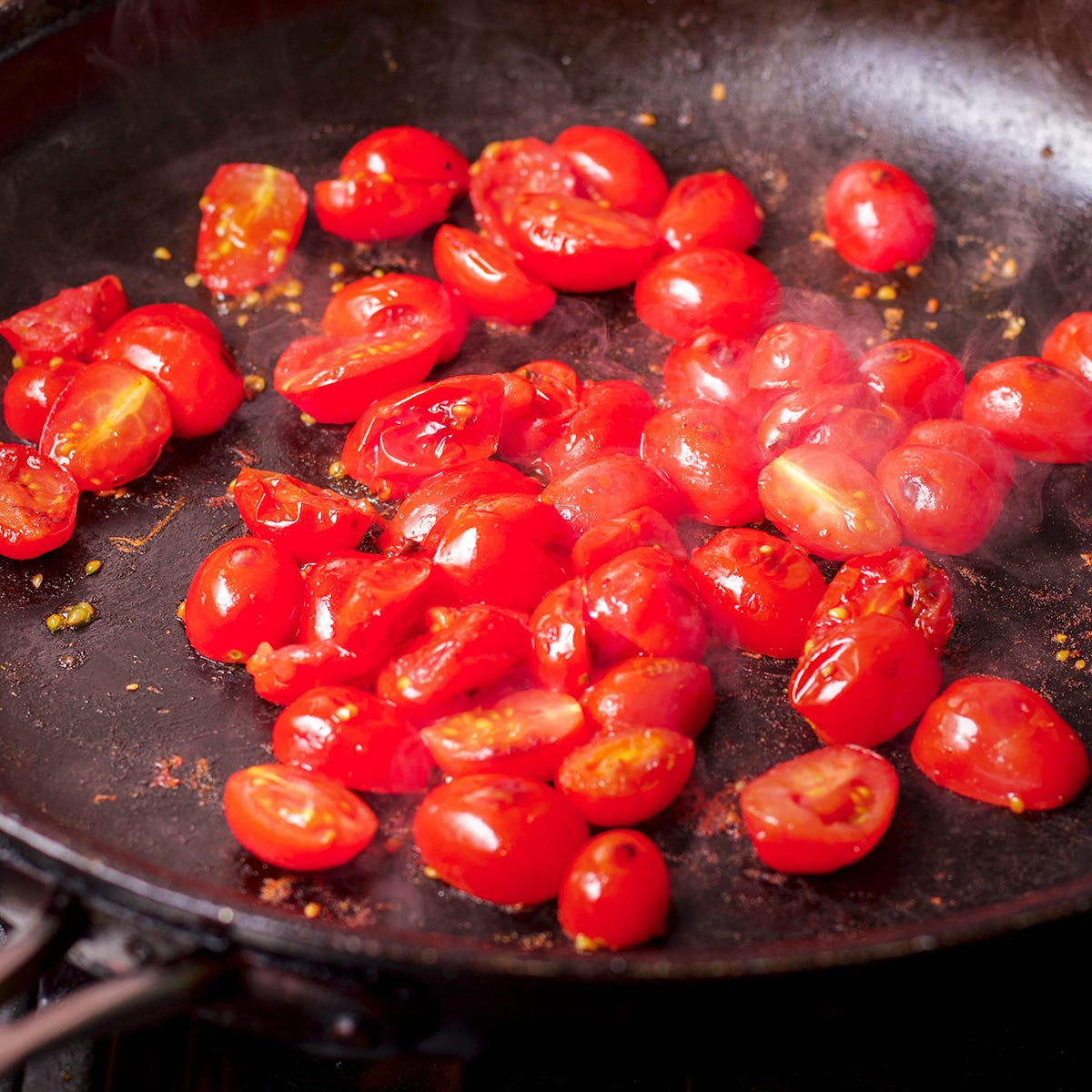 Remove the asparagus from the saucepan, placing it in a bowl. Add the cherry tomato halves to the skillet. Sprinkle with a bit of salt and cook, stirring frequently, until the tomatoes are charred and shriveled, about 3 minutes. Remove the pan from the heat and scoop the tomatoes into a small bowl.