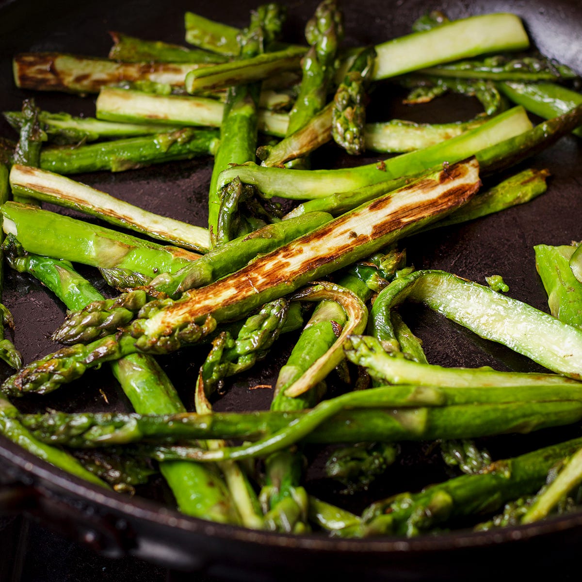 Add 1 tablespoon of oil to a large skillet and set it over high heat. When the oil is just beginning to smoke, add the blanched asparagus. Cook, stirring every once in a while, until the spears are well charred.