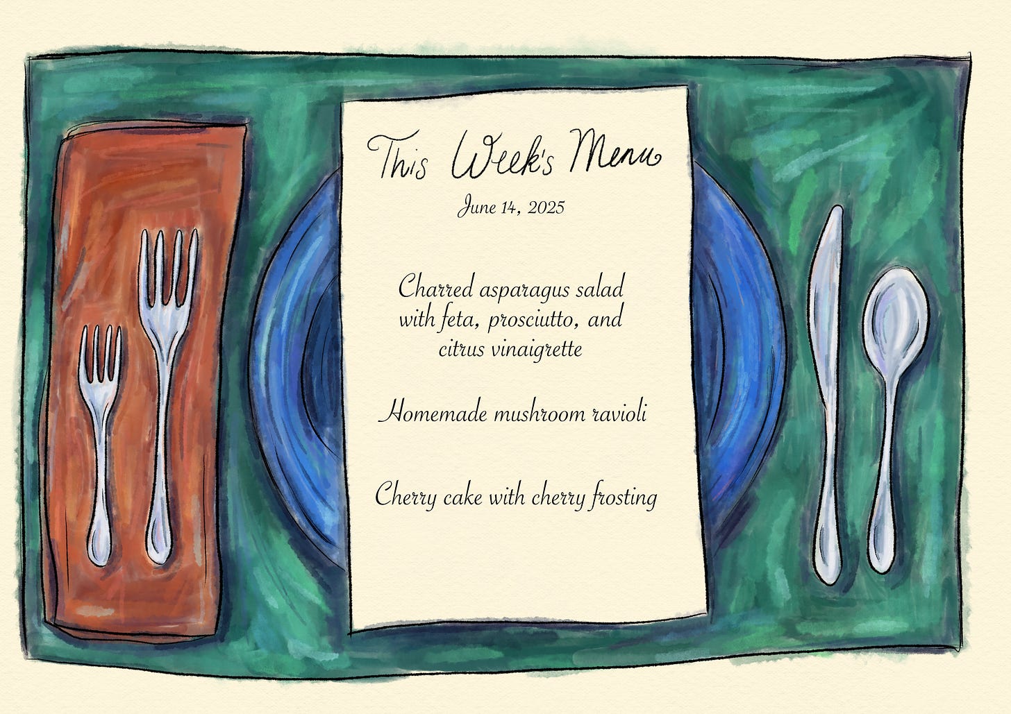 This week’s menu: Charred asparagus Salad with feta, prosciutto, and citrus vinaigrette, Mushroom Ravioli, and Cherry Cake with Cherry Frosting! 🍒
