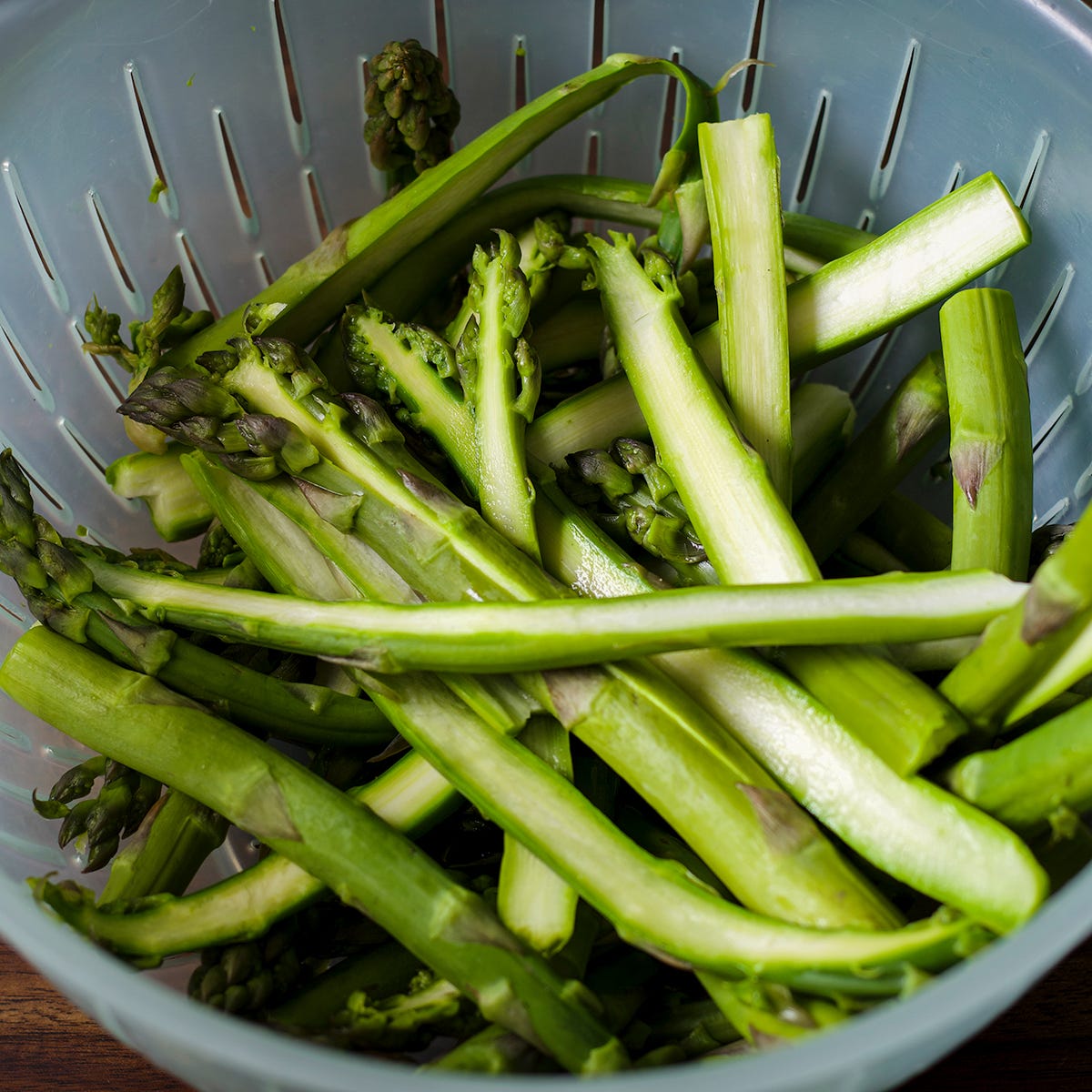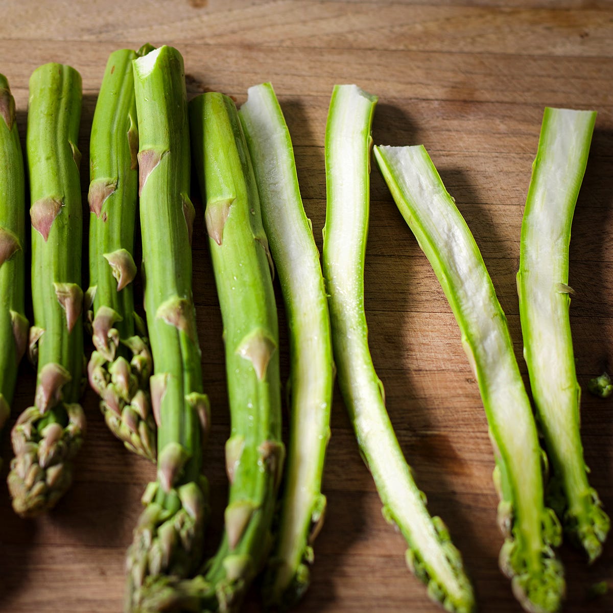 Break the asparagus where each spear wants to naturally snap in half. Discard the bottom half of the stalks (or save to make vegetable broth). If your spears are on the thick side, cut them in half lengthwise. This is not necessary if your spears are pencil thin.